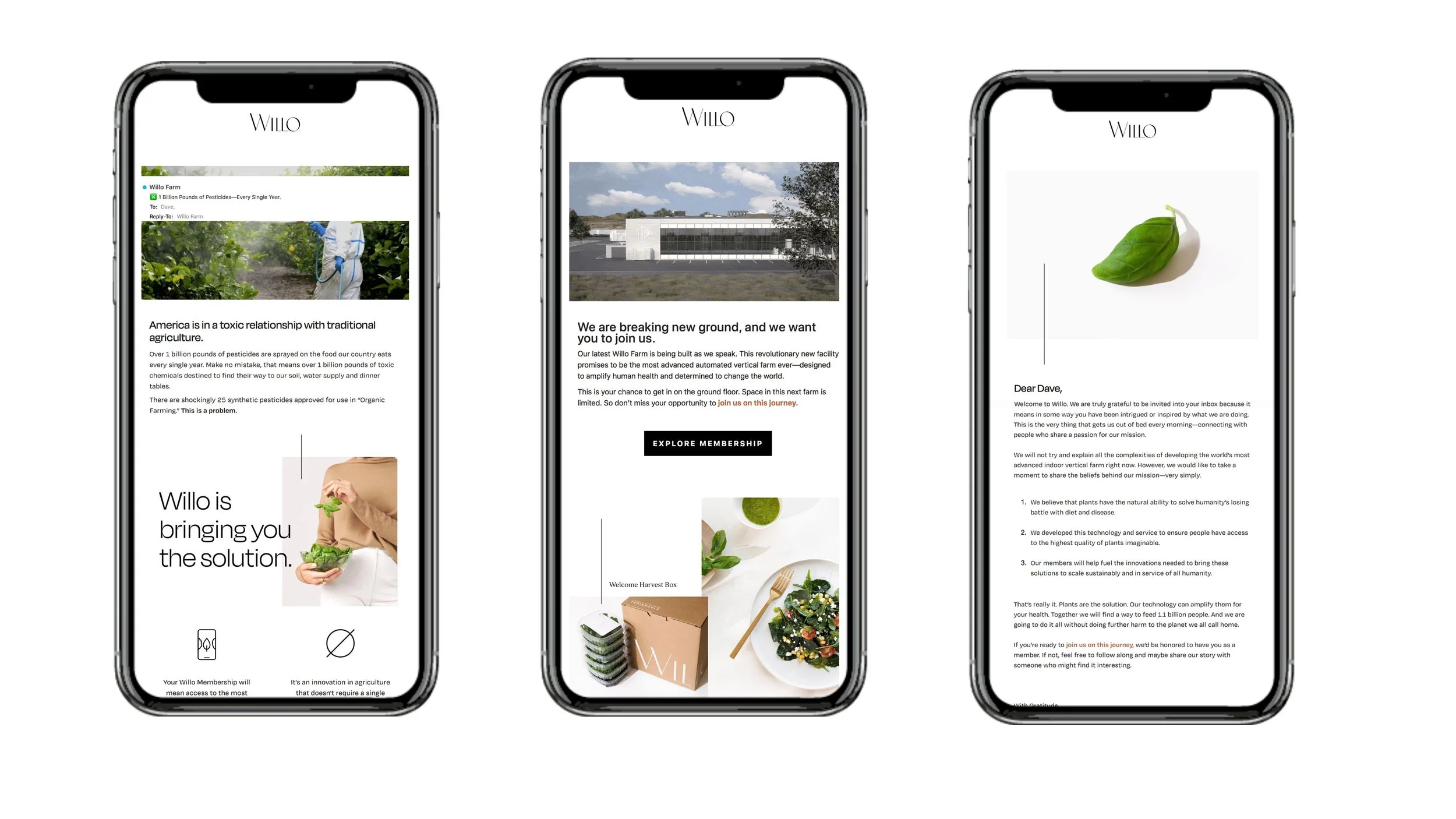 “We Grow Together.” Willo Farm was launching as the first-ever personalized vertical farming service—an exclusive experience that provided DTC access to the most premium produce on the planet. But the promise was even bigger than the product. Every Willo membership helped power the innovations needed to build a more sustainable system to feed, fuel, and heal all of humanity. How do you inspire high-earning thoughtful-eaters to take a chance on “The Tesla of Kale?”